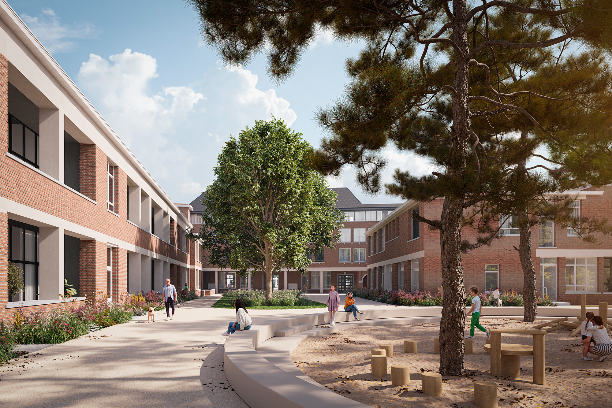 Achter de karaktervolle gevel van de voormalige Sint-Lutgardisschool, aan het bruisende Gemeenteplein in Mortsel, verrijst een nieuw en uniek woonproject: de volgende fase van het Stadsterras.